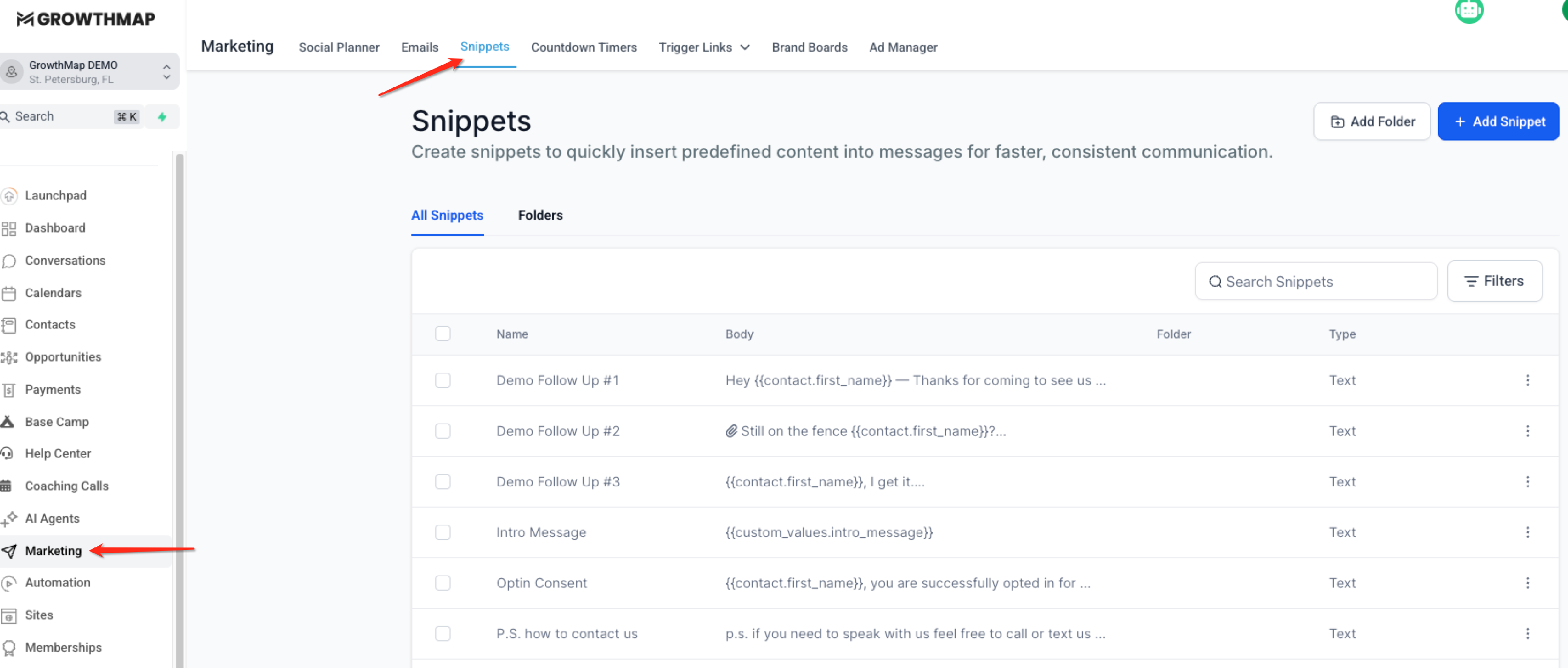 Note: Text snippets are reusable short message templates for automations, campaigns, and direct messages.
